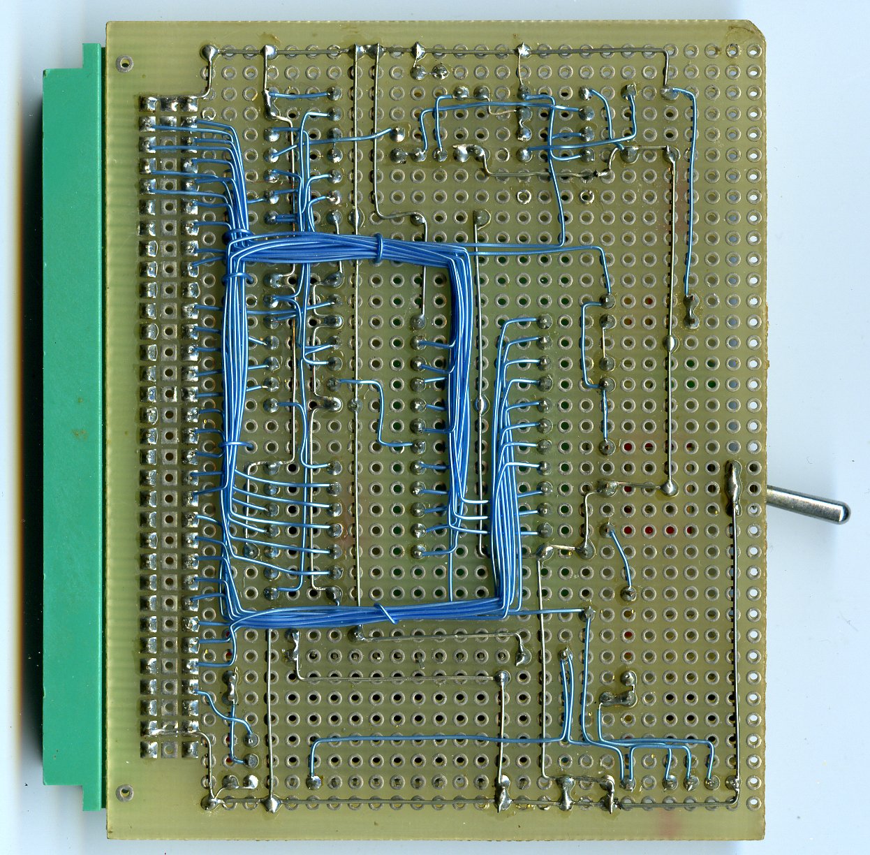 | Phunsy-2 6809 micro computer. This should have been my 2nd generation system. It had lots of features but I never finished it. The other side of the board has no wires;-) Just a bit later I had an Atari ST and it was no use completing this board as it was impossible to keep up with the fast growing technology. Although the 6809 cpu never really made it, I still think this was one of the greatest 8-bit cpu's. The two missing IC's on the board should have functioned as collor look-up table for the video signal. | |